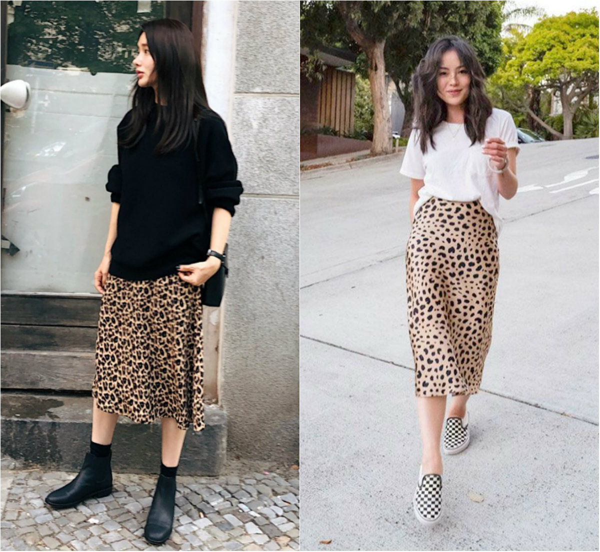 Họa tiết da beo là dấu hiệu nhận biết 1 cô gái có gu ăn mặc khác biệt và không ngại thay đổi. Hãy chọn chiếc áo thun trắng để không khiến người đối diện rối mắt khi bạn diện chung với chân váy họa tiết da beo.