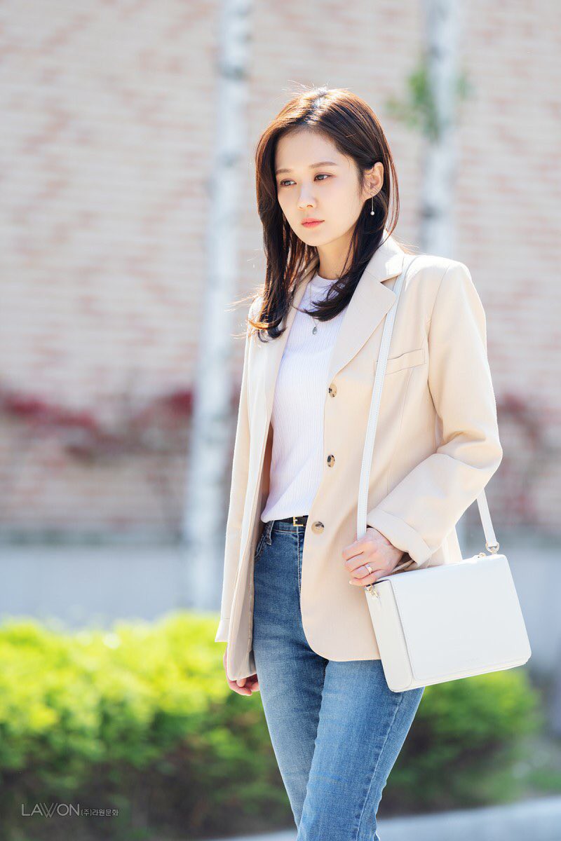 Xuống phố hay thậm chí là trong các cảnh quay, Na-ra cũng thường xuyên diện áo thun như một cách hack tuổi. Chiếc blazer giúp nữ diễn viên trông lịch sự hơn. Đây cũng là cách mặc mà các bạn trẻ Hàn Quốc thường diện mỗi độ thu về.